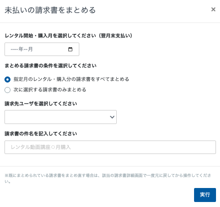 「指定月のレンタル・購入分の請求書をすべてまとめる」を選択すると、