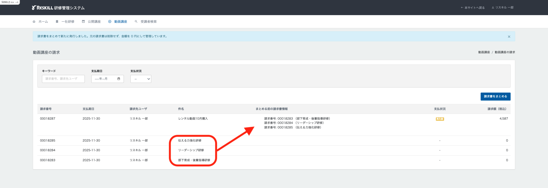 1)研修管理システム > 動画講座> 動画講座の請求一覧をクリックします。