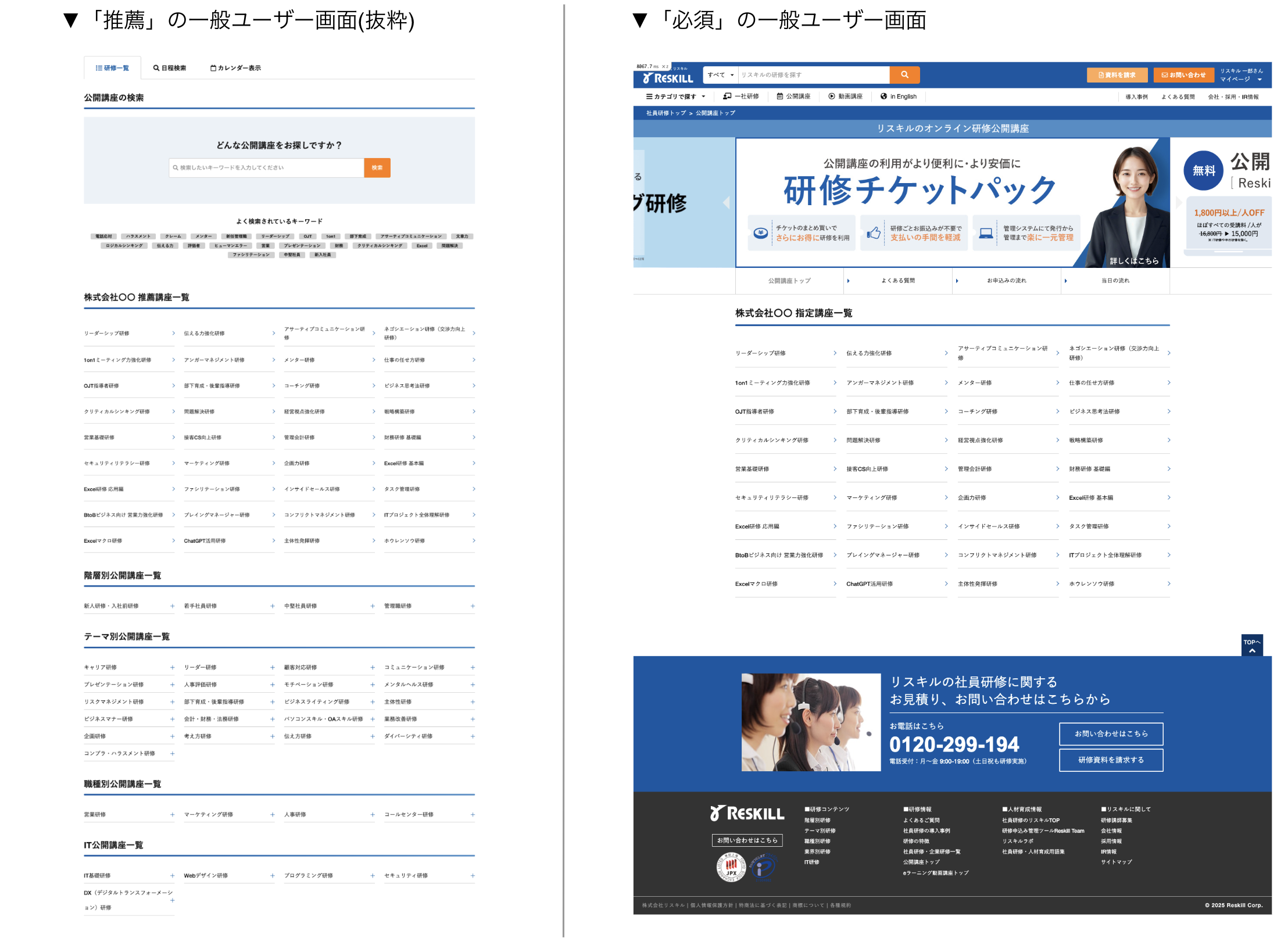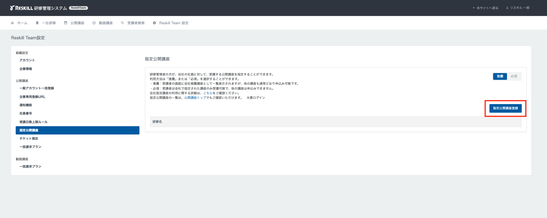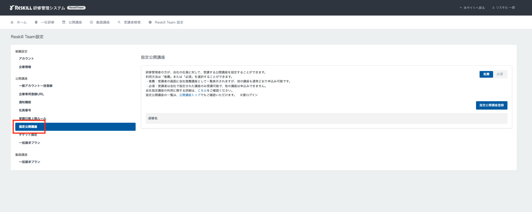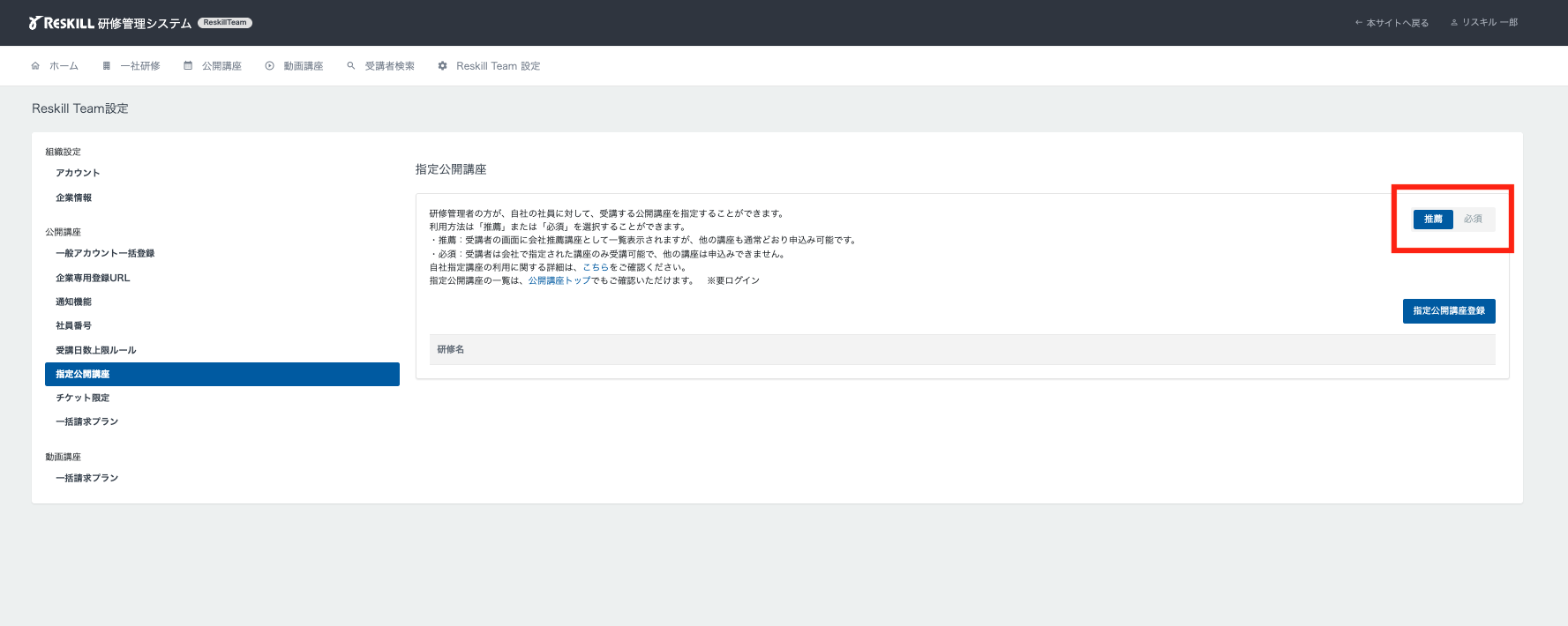 ・「必須」:受講者は会社で指定された講座のみ受講可能で、他の講座は申込みできません。